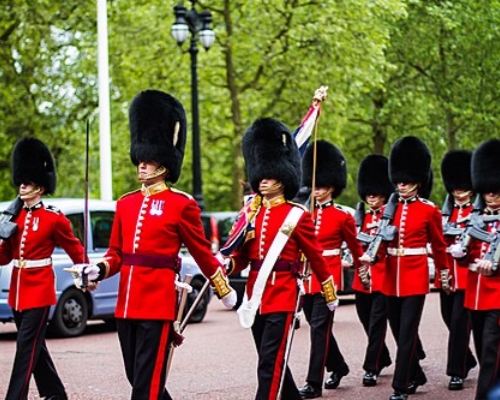 Iconic Features: Bright red tunics, towering bearskin hats.